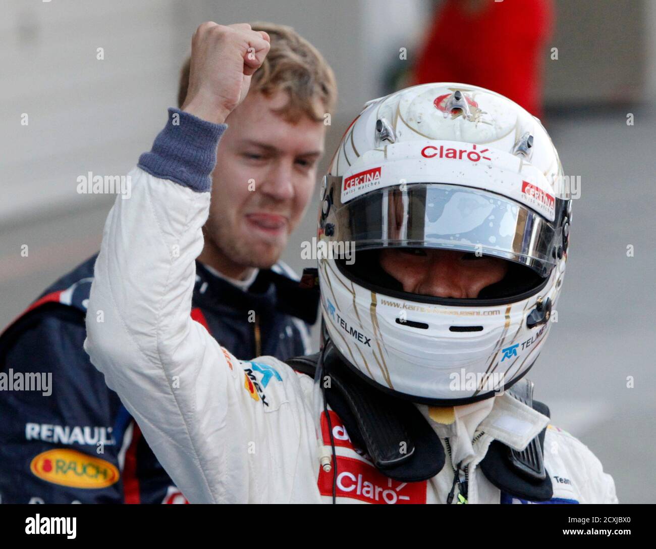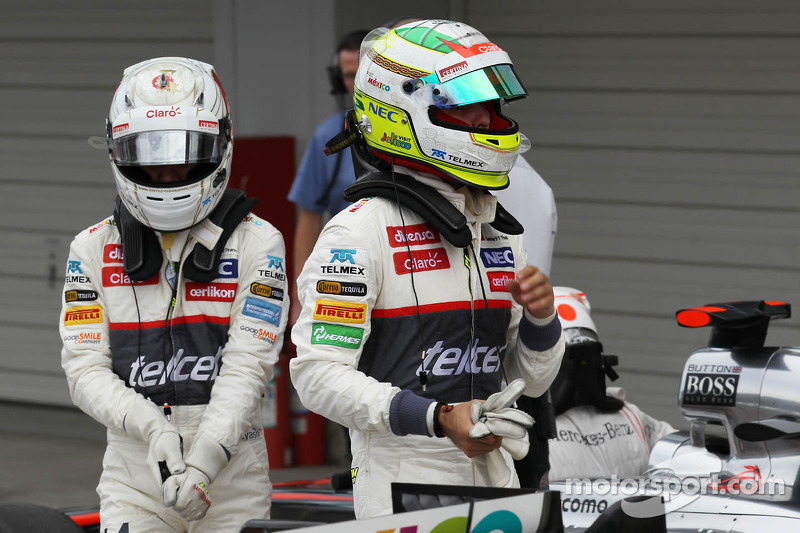 Sauber Formula One Driver Sergio Perez R Of Mexico And Team Mate Kamui Kobayashi Of Japan Walk In The Pit Lane Following The Qualifying Session Of The Japanese F1 Grand Prix At