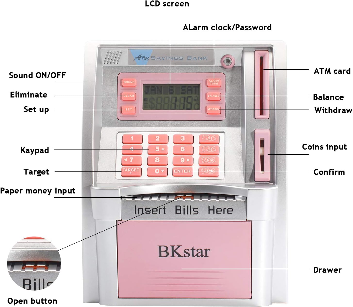 Amazon Com Goodsfederation Electronic Atm Savings Bank Digital Piggy Money Bank Machine Electronic Cash Box With Debit Card Password Login Voice Prompt Coin Recognition Targets Setting Sliver Pink Toys Games