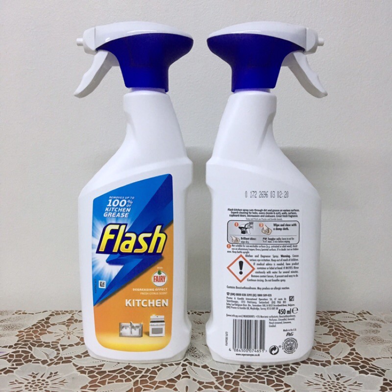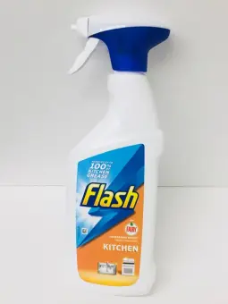 Just spray Flash Kitchen spray on soiled surface until thoroughly covered Rinse (or wipe with a damp cloth) for a shiny clean surface For heavy soil such as burnt on food leave the cleaner spray to act for 3 minutes before wiping On painted surfaces, try product on a small inconspicuous area before using. Just spray it everywhere, wipe it over and you are already done!. Specially designed for the kitchen, the Flash Kitchen spray cleaner blends Flash cleaning power with the degreasing effect of Fairy to quickly dissolve grease & dirt while leaving a fresh scent & brilliant shine This surface spray cleaner gives a thorough cleaning to all your kitchen surfaces hob, cooker top, sink, stainless steel, counter tops, walls and surfaces, cupboard doors, microwave.