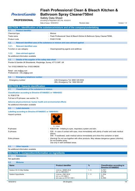 Flash Bathroom Cleaner Spray Write a review Flash MultiSurface Concentrated Cleaner Blossom Breeze Write a review Flash Multi Surface Concentrated Cleaner Lemon Write a review Flash Speedmop Starter Kit Write a review Flash Cleaning Wipes Write a review Flash Ultra Power Liquid Gel 600ml. Details about Flash Bthroom Cleaner 1x750ml Spray Flash Bthroom Cleaner 1x750ml Spray Item Information Condition New Quantity 9 available / 1 sold. Do not use together with other products May release dangerous gases (chlorine) P&G Professional FLASH Clean & Bleach Kitchen & Bathroom Safety Data Sheet according to Regulation (EC) No 453/10 28/01/15 EN (English) 2/7 23 Other hazards.